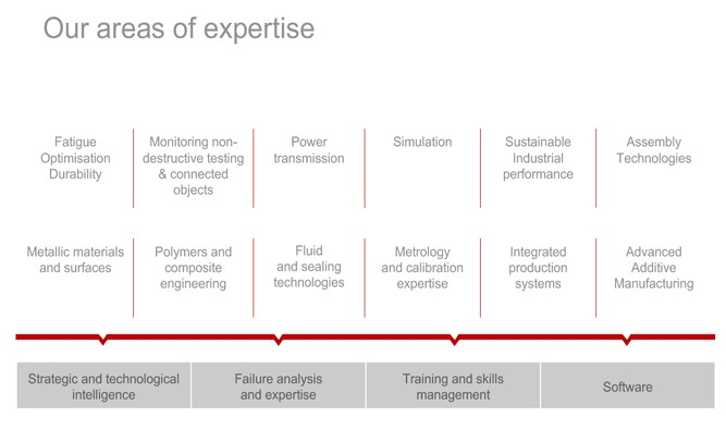 El abanico de competencias y conocimientos propuestos por el CETIM es muy amplio (véase imagen inferior + “materiales metálicos y compuestos, tratamientos de superficie, procesos de fabricación, ensamblaje, estanqueidad, fluidos y flujos, END, …”).