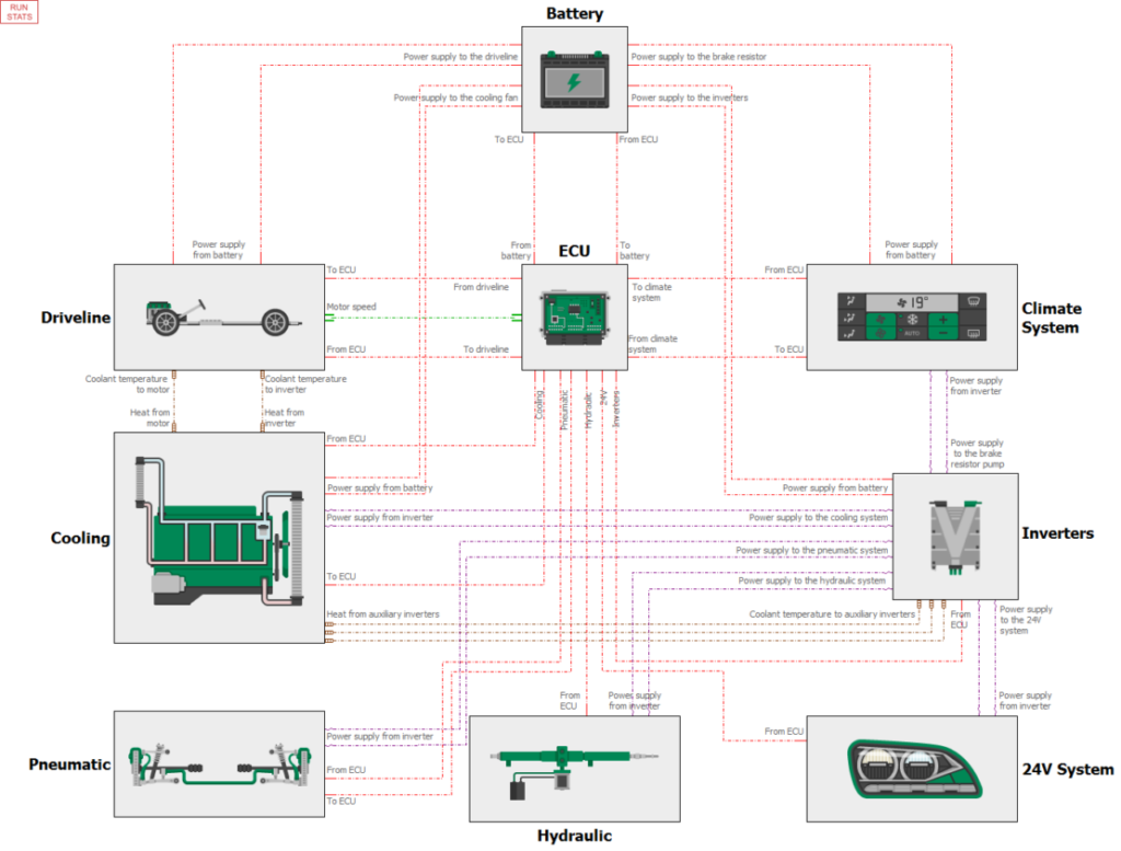 Primero, VDL creó modelos detallados de las celdas y paquetes de baterías para realizar simulaciones sobre su comportamiento. Combinando todos los componentes de un autobús, incluyendo la unidad de control del vehículo, VDL podía predecir con precisión diversos comportamientos y optimizar la selección de proveedores.
