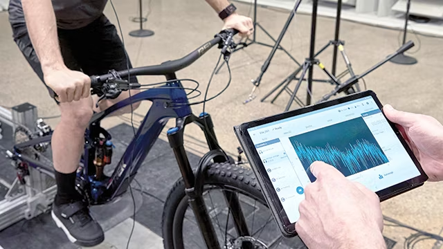 “Using Simcenter SCADAS XS to perform field testing is pretty easy because it fits in a bike jersey pocket, integrates seamlessly with the binaural headset and can be controlled wirelessly with the Simcenter Testlab Scope App on a tablet outside,” adds Harder. “During the trail tests, we also used a GPS and action camera to visualize the data in Simcenter Testlab Neo.”