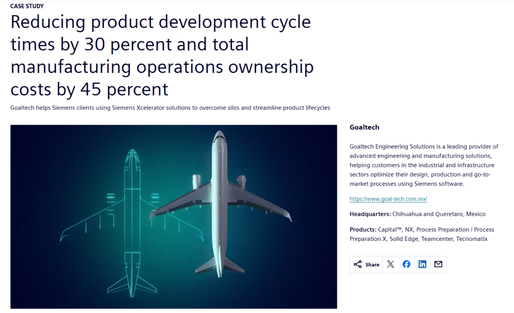 The case study describes how Goaltech, as an authorized Siemens partner, has supported Mexican companies in implementing solutions that optimize processes and reduce costs. The publication highlights our expertise in tools such as Tecnomatix, NX, Solid Edge, and Valor, which are essential for improving efficiency in electronics manufacturing and automation.