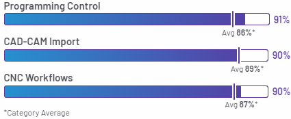 Los clientes evaluaron el software CAM mediante el marco de puntuación de G2. A continuación se ofrece información detallada sobre la valoración de NX CAM por parte de los usuarios en algunas de las funciones clave: